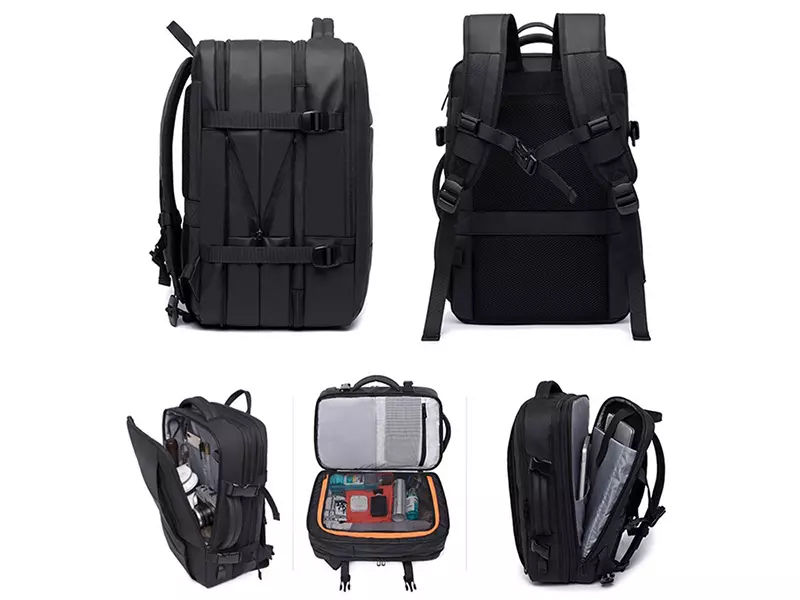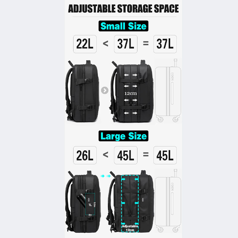 ویژگی ها محصول اندازه 52×34×27 سانتی متر جنس پارچه آکسفورد+پلی استر+پارچه ضد باران مناسب برای لپتاپ 17.3 اینچ درگاه شارژ USB قابلیت گسترش از 35 لیتر به حداکثر 45 لیتر قابلیت باز شدن تا 180 درجه قابل استفاده به عنوان چمدان کوچک ضد آب و ضد عرق